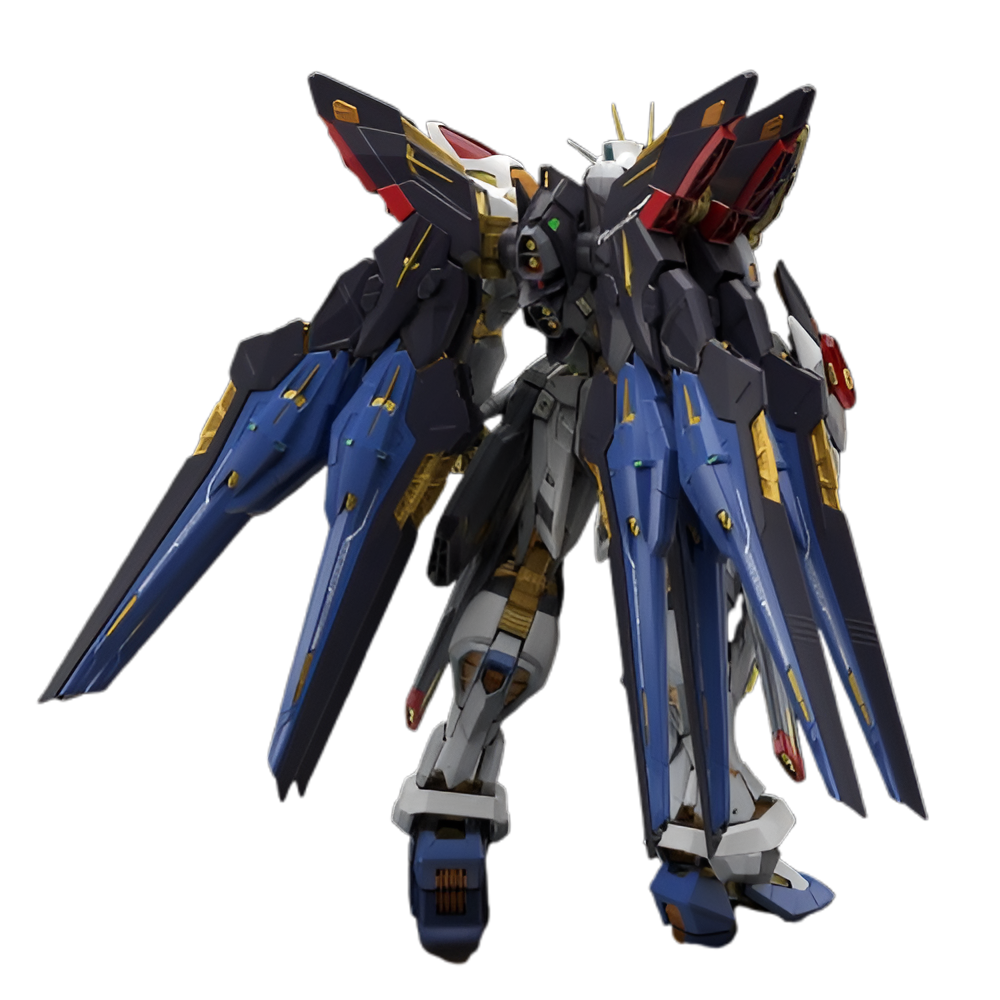 O Strike Freedom brilha já na montagem graças a 6 acabamentos metálicos diferentes—eletro-banho, duas injeções metalizadas e decalques gravados—enquanto as asas Full Burst, rifles DRAGOON e sabres de feixe se encaixam com precisão.